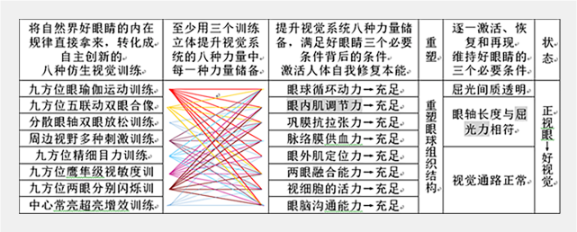 通过仿生思维,将成就自然界好眼睛的内在规律直接拿来与现代科技相融合,构成了眼瑜伽仿生眼操仪自主创新的如上表所示的八种仿生视觉训练。用于多角度的立体提升视觉系统八种力量中的每一种力量储备,借此告别一台仪器只有一个训练功能,只提升视觉系统八种力量中一种调节力量的时代。借此告别只恢复维持好眼睛三个必要条件中屈光力半个必要条件的时代。完善眼科的好眼睛三个必要条件的定义