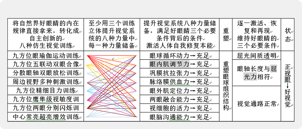 通过好眼睛的三个必要条件及相应病因病机推演,如上表所示,我们找到了好眼睛三个必要条件背后的起支撑作用的八种力量,此八种力量储备充足,好眼睛的三个必要条件会逐一的得到满足,换言之由于深入到了视力康复的底层逻辑,无论是近视、远视、散光、弱视都是用相同的仪器,都是通过提升视觉系统八种力量储备,消除或缓解八种相应视疲劳的方法激活人体自我修改本能。将自然界好眼睛的成功经验直接拿来