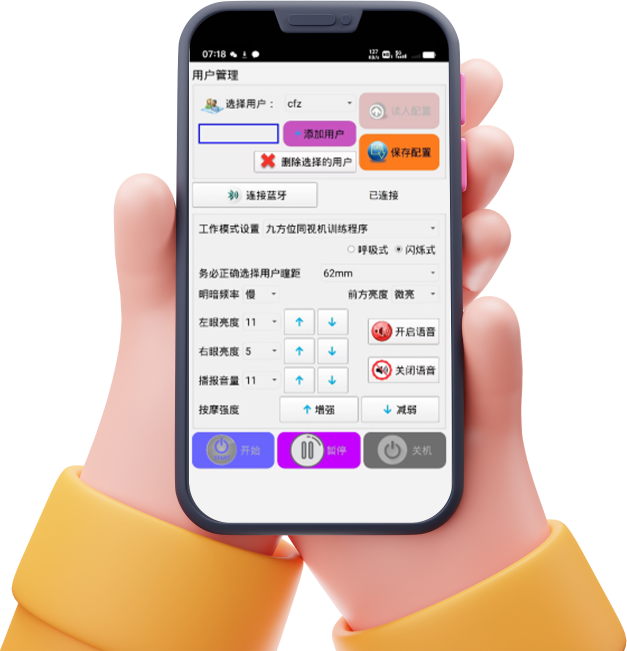 例如:用户cfz,瞳距62mm,两眼屈光参差接近300度,左眼度数高远视性弱视,且偶尔出现间歇性外斜视。在手机APP上进行了上述个性化数据的输入。点击"开始"后进入(左眼增加亮度和训练力度)的九方位同视机训练程序中,"提升左眼的发光视点亮度",使其成为主视眼,"增加左眼训练力度",增加左眼视力提升速度,可有效减少两眼的屈光参差度数差异。此外,本程序通过"互补位周边视野刺激",使两眼远处周边视野融合,为九方位同视机训练时顺利形成精细立体视觉奠定坚实基础,一台仪器,一个组合训练,同时涉足多个视觉难题的救助。
